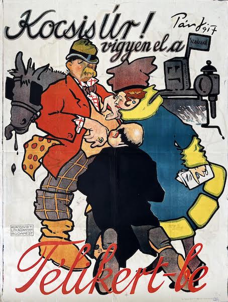 Mr. Coachman! Take me to the Winter Garden is a 1917 Hungarian vintage advertising poster designed by Jozsef Pan. Originally called Jardin d’ Hiver, later renamed Telikert (Winter Garden) was a very popular bar, cafe and theater in Budapest during the 1910s, in the building which today houses Thalia Theater.