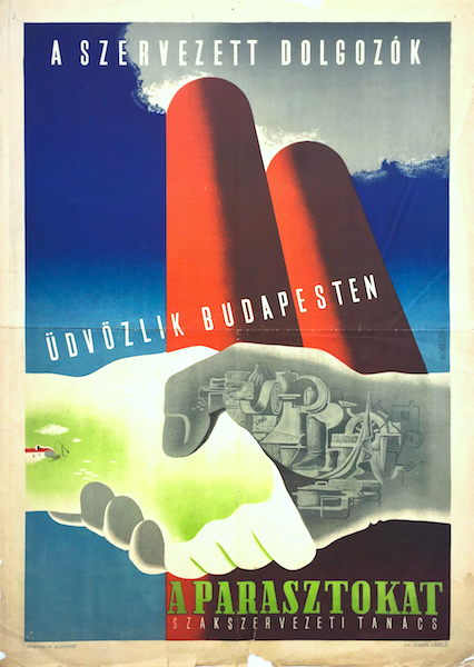 The organized workers welcome the peasants in Budapest - Trade Union Council is a 1948 vintage Hungarian communist propaganda event poster designed by Gyorgy Konecsni.