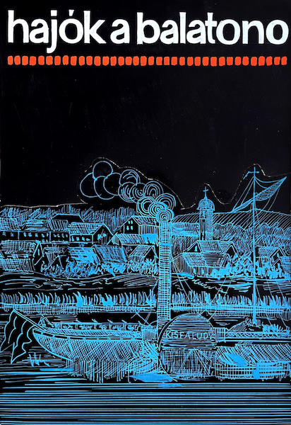Boats on Lake Balaton shipping history exhibition is a 1966 vintage Hungarian exhibition poster designed by Laszlo Katona.