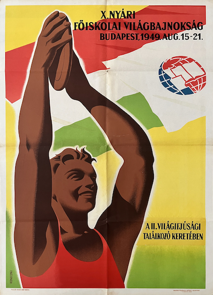 X. Summer College World Championship is a 1949 Hungarian sport event poster designed by Gyorgy Konecsni.