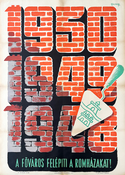 1948, 1949, 1950 - The capital rebuilds the ruined houses! is a 1948 propaganda poster designed by Gyula Macskassy.