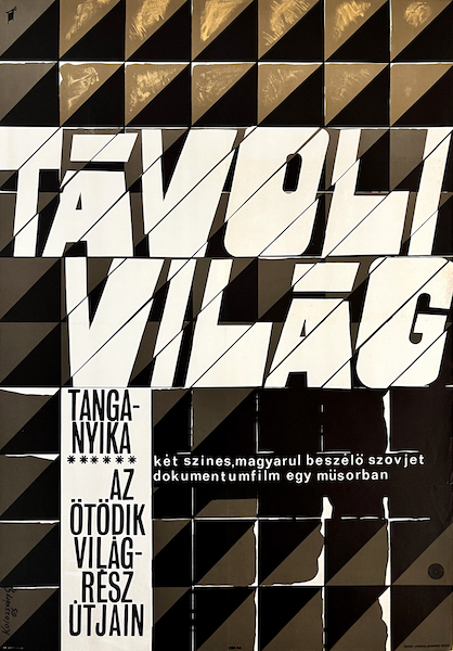Distant World is a 1965 Hungarian vintage movie poster designed by Gyorgy Kolozsvary, advertising two Soviet Russian documentary films: Lake Tanganyika and On the Roads of the Fifth Continent.